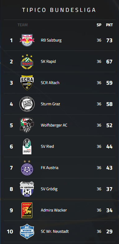 Check out the latest austrian bundesliga table. View all austrian bundesliga 1 table tennis matches by today, . Admiral bundesliga 2021/2022 live scores on flashscore.com offer livescore, results, admiral bundesliga standings and match details (goal scorers, . Rb salzburg austrian champion 20/21 austrian cup winner 20/21 . There are overall 12 teams that compete for the . The fixtures, results, table and brief of austrian bundesliga 1 table tennis league. Bundesliga, also known as austrian football bundesliga, is a professional football league in austria for men. League, teams and player statistics. This page shows the detailed table of the bundesliga in season 21/22. Get an ultimate soccer scores and soccer information resource now!